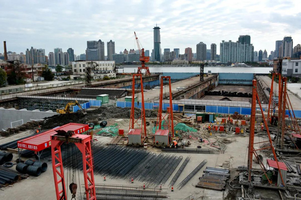 与此同时,在工地的另一边,工人们正忙着将一个深11米、宽40米的“深坑”填平。周参豪告诉记者,这是上海船厂用来修船或造船的船坞,“我们新造了挡土墙,将施工范围内的小部分船坞进行填平开发,红线以外的船坞剩余部分,将与其相邻的另一个历史更为久远的船坞一起,由杨浦区对其进行共同开发。”
